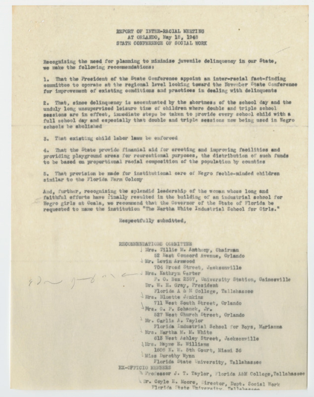 At the 1948 Orlando State Conference of Social Work, which had an interracial meeting, members discussed ways to minimize juvenile delinquency in Florida. They mentioned a need to enforce existing child labor laws, increase school hours, provide financial aid, appoint a regional, interracial fact-finding committee for delinquents, and more.