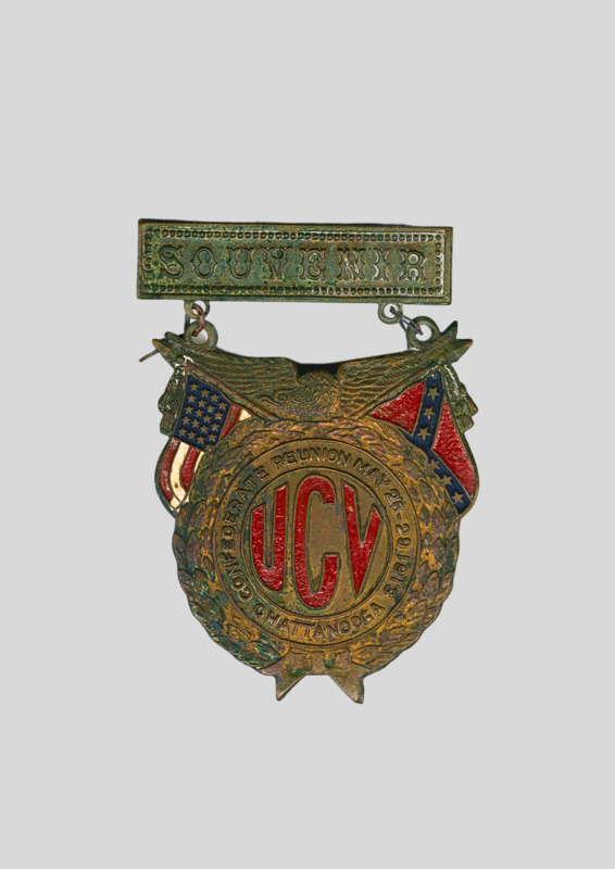 This 1913 Confederate Reunion medal, a souvenir from the United Confederate Veterans (UCV) gathering in Chattanooga, commemorates veterans of the Civil War. The medal features Confederate symbols and celebrates the reunion of former soldiers.