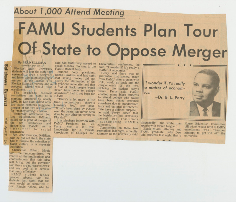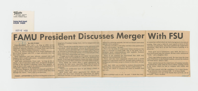 This article provides a more nuanced position Benjamin L. Perry held on merging with Florida State University. While he was adamant about maintaining Florida A&M’s autonomy, Perry made sure to say that the institution “offers opportunities for blacks and whites” as justification for that stance.