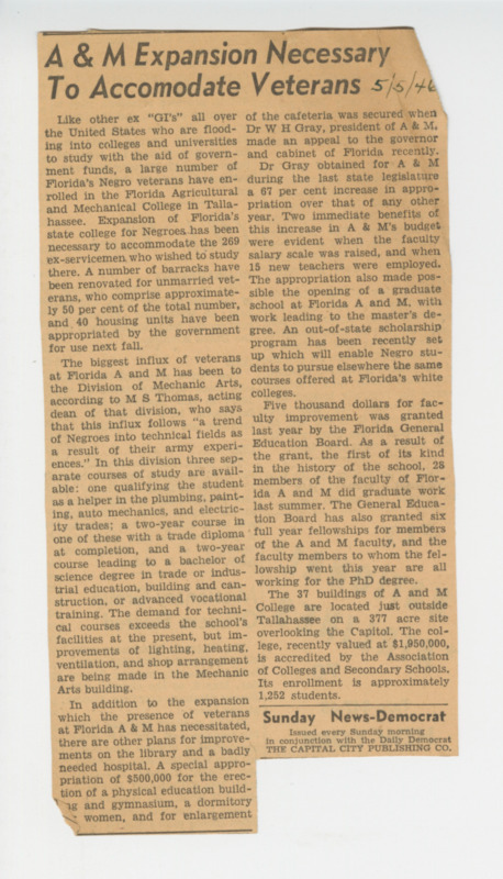 FAMC expanded to accommodate an influx of Florida Negro veterans enrolling, particularly in the Division of Mechanic Arts and technical fields. With $500,000 allocated for a new physical education building and recreation gymnasium, Dr. Gray also introduced out-of-state scholarships and the first GI Bill at FAMC to support veterans' education.