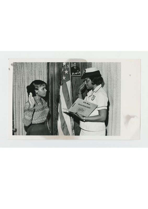 This black and white photograph shows a Black female U.S. Naval Officer swearing in another Black female. The officer holds a book titled “U.S. Navy Enlisted Service Record.”