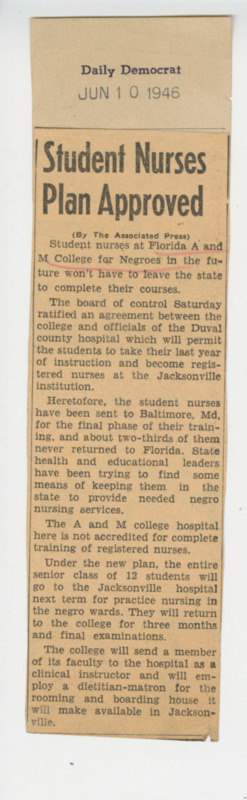 The Daily Democrat celebrated a milestone for FAMC nursing students, who no longer had to leave Florida to complete their training. The new agreement allowed 12 seniors to finalize their education in Duval County, Jacksonville, overcoming FAMC hospital's accreditation gap and advancing opportunities for future nurses.
