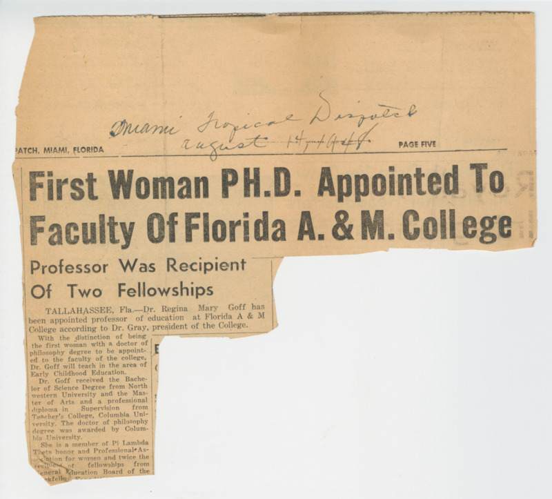 Dr. Regina Mary Goff, the first woman Ph.D. faculty member at Florida A&M College, was featured in a 1946 newspaper clipping. Her academic focus on philosophy and early education, coupled with two fellowships, highlighted her pivotal role in shaping the future of education at the college.