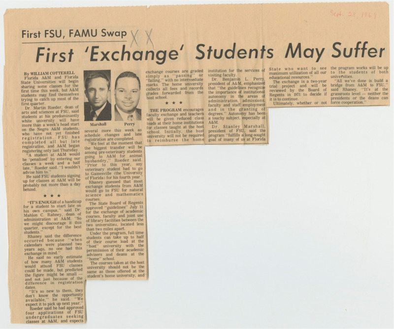 William Cotterell wrote this news article for an unidentifiable news publication. It discusses a new joint opportunity between Florida A&M University and Florida State University but quoted executive officials from FSU warning FAMU students from joining because they risk falling behind in class due to differing institution registration periods.