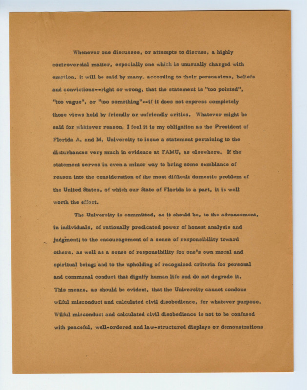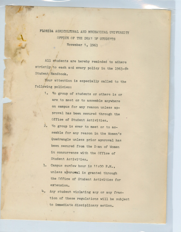 In 1960, following a civil riot, FAMU released a statement addressing student demonstrations. The university faced criticism for suspending two students and placing 30 on strict probation, asserting that the disciplinary actions were essential to restoring order and upholding its standards.