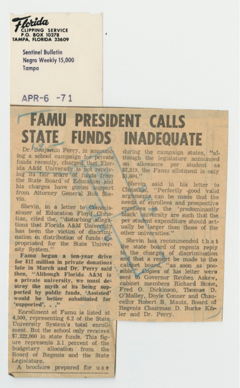 In the early 1970s, President Dr. Benjamin Perry announced a private funding campaign for the university after asserting that the State Board of Education was withholding FAMU’s fair share of funds, granting them only 3.1% of the budget from the Board of Regents and the State Legislature. Then-Attorney General Bob Shervin supported his statements.