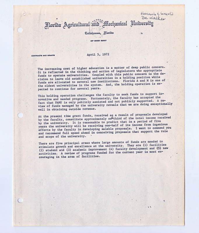 This collection contains a 1972 report from Florida A&M’s Office of Contracts and Grants discussing the increasing cost of higher education due to politicians appropriating funds for university operations. The document presents figures on collateral programs for funding support, aid as a portion of income, and more.