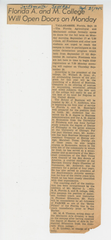 This document outlines the official formal opening of the Florida Agricultural and Mechanical College’s School of Business for the first year in 1945-1946. The press release also discusses a new addition to FAMC faculty and an “in memorium” segment.