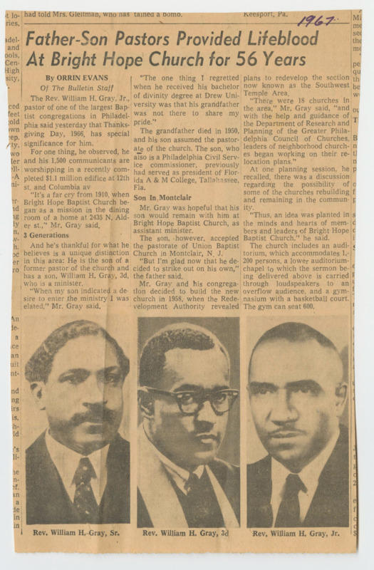 Orrin Evans of The Bulletin staff wrote this piece on three generations of pastors in the local community, one of them being former Florida A&M University President Rev. William H. Gray, Jr. William H. Gray, Jr. was the pastor of one of the largest Baptist congregations in Philadelphia and his son, William H. Gray, III was a minister.