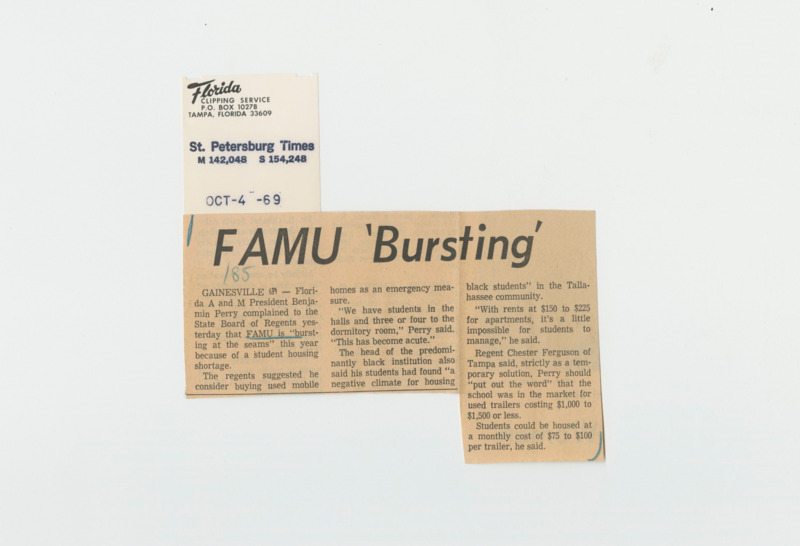 A 1969 newspaper clipping from the St. Petersburg Times describes an interaction between Florida A&M President Dr. Benjamin L. Perry and the State Board of Regents. Perry complained that “FAMU is ‘bursting at the seams’ because of a student housing storage,” a problem the institution has recurringly faced in recent years.