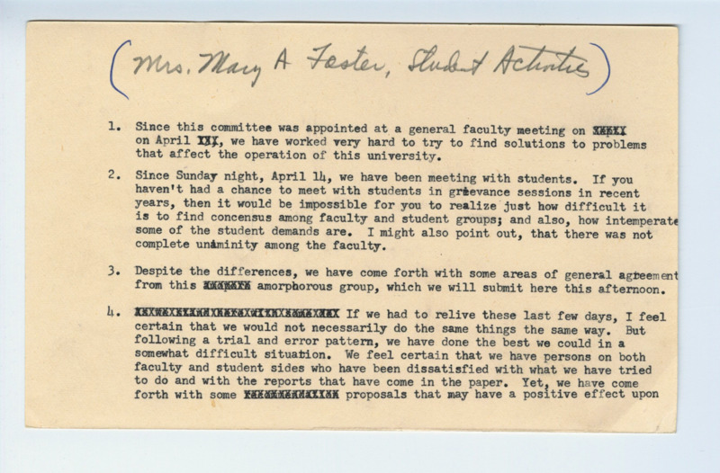 An outline of the report by the FAMU Faculty Administration Committee addresses the crisis following MLK’s assassination and the resulting student revolts. The committee highlights President Gore's efforts to seek constructive change while maintaining university operations and preserving FAMU's reputation amidst the closure.