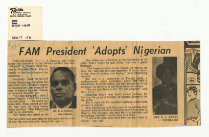 When 20-year-old Genita Ekpenyong’s father was murdered in Nigeria’s Biafran conflict, B. L. Perry (who met her father when he was a guest professor in Nigeria) temporarily became her guardian so she could complete her education. Despite this, Ekpenyong was itching to return to Nigeria because the violence in the U.S. was too much for her to bear.