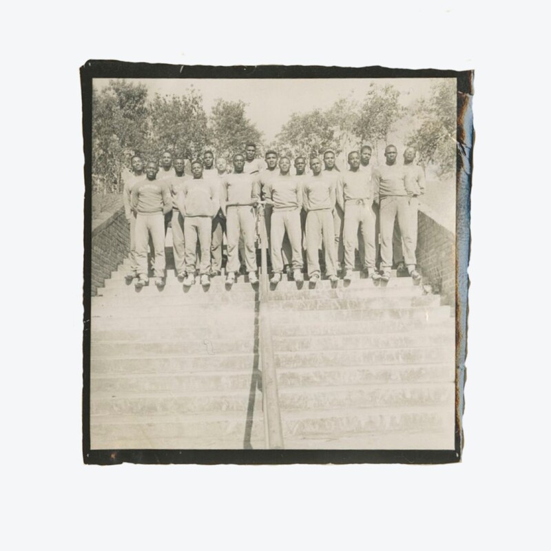 This photograph, taken by Nipper (as inscribed on the back), shows what appears to be a Florida A&M men’s sports team standing on the staircase by the Pete Griffin Track field. The two men in the center of the photo appear to be holding a baton, but it is unclear to say with certainty when this was taken or which sports team this was due to fading.