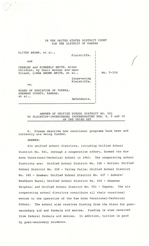 Case Data and Exhibits for Brown III, a relitigation of Brown v. Topeka Board of Education (1954) that corrected resegregation issues caused by open enrollment school choice in 1992. Document to the plaintiffs from the defense in response to a question about how the vocational training programs have been and are currently being funded.