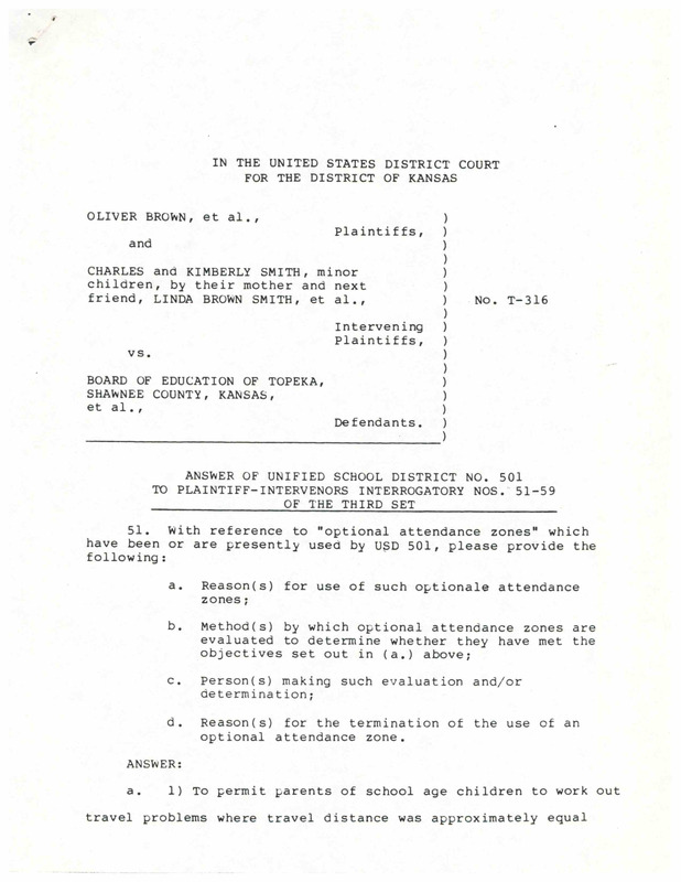 Case Data and Exhibits for Brown III, a relitigation of Brown v. Topeka Board of Education (1954) that corrected resegregation issues caused by open enrollment school choice in 1992. Document to the plaintiffs from the defense in response to questions about optional attendance zones, including why they exist, how they are evaluated, and more.