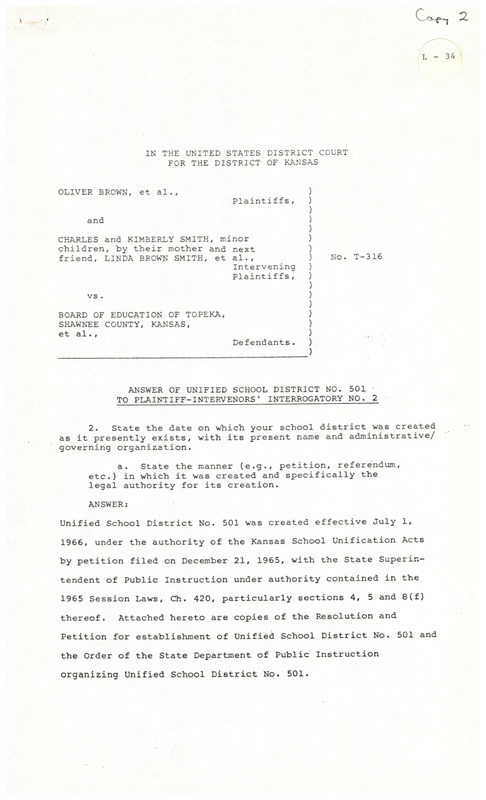 Case Data and Exhibits for Brown III, a relitigation of Brown v. Topeka Board of Education (1954) that corrected resegregation issues caused by open enrollment school choice in 1992. Document to the plaintiffs from the defense in response to a question about the creation of the school district and how it is presently governed.