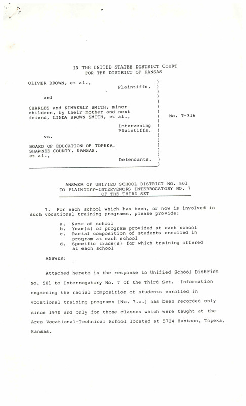 Case Data and Exhibits for Brown III, a relitigation of Brown v. Topeka Board of Education (1954) that corrected resegregation issues caused by open enrollment school choice in 1992. Document to the plaintiffs from the defense in response to questions about vocational training programs, including names of schools, types of training, and more.