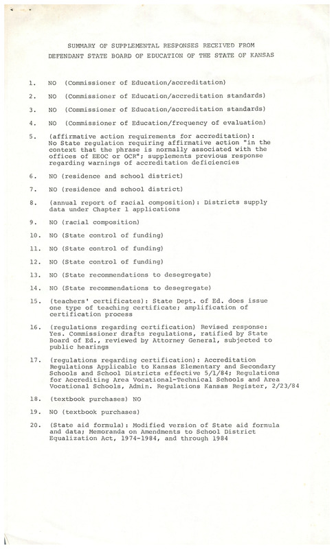 Case Data and Exhibits for Brown III, a relitigation of Brown v. Topeka Board of Education (1954) that corrected resegregation issues caused by open enrollment school choice in 1992. A document that lists a summary of all supplemental responses to the Plaintiff attorneys submitted by the defendant State Board of Education of Kansas.