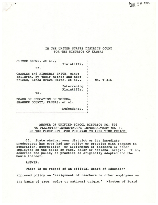 Case Data and Exhibits for Brown III, a relitigation of Brown v. Topeka Board of Education (1954) that corrected resegregation issues caused by open enrollment school choice in 1992. Document to the plaintiffs from the defense in response to a question about policies concerning segregation of teaching assignments based on race or national origin.