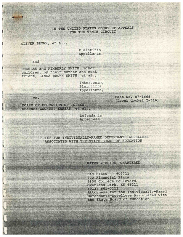 Case Data and Exhibits for Brown III, a relitigation of Brown v. Topeka Board of Education (1954) that corrected resegregation issues caused by open enrollment school choice in 1992. Court brief that upholds the rulings in favor of the individually named members of the State Board of Education of Kansas not being complicit in school segregation.