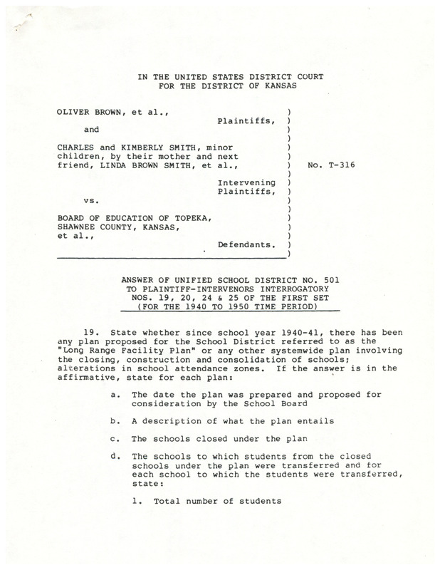 Case Data and Exhibits for Brown III, a relitigation of Brown v. Topeka Board of Education (1954) that corrected resegregation issues caused by open enrollment school choice in 1992. Document to the plaintiffs from the defense answering detailed questions about the district’s Long Range Facility Plan.