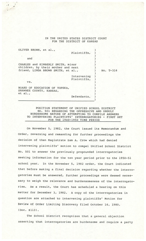 Case Data and Exhibits for Brown III, a relitigation of Brown v. Topeka Board of Education (1954) that corrected resegregation issues caused by open enrollment school choice in 1992. In this position statement, the defense argues that certain requests for documents from the plaintiff team are “unduly burdensome” because of time constraints.