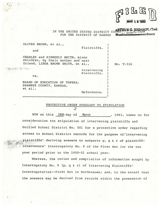 Case Data and Exhibits for Brown III, a relitigation of Brown v. Topeka Board of Education (1954) that corrected resegregation issues caused by open enrollment school choice in 1992. This court order places limitations on some of the documents requested by the defense due to redundancy and personal information that is included in some records.