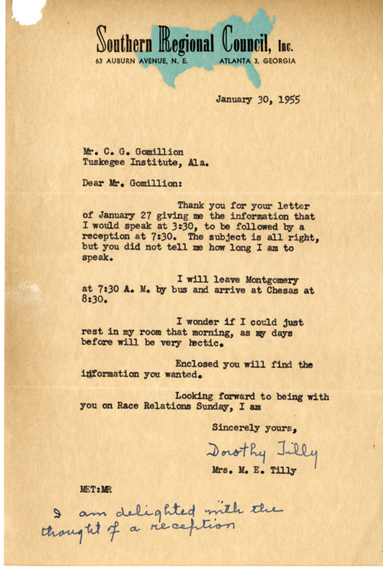 A letter from Mrs. Dorothy Tilly to Charles G. Gomillion in which she states that she will speak at 3:30 p.m. She also asks if she can rest in the morning due to the hectic nature of the past few days of travel.
