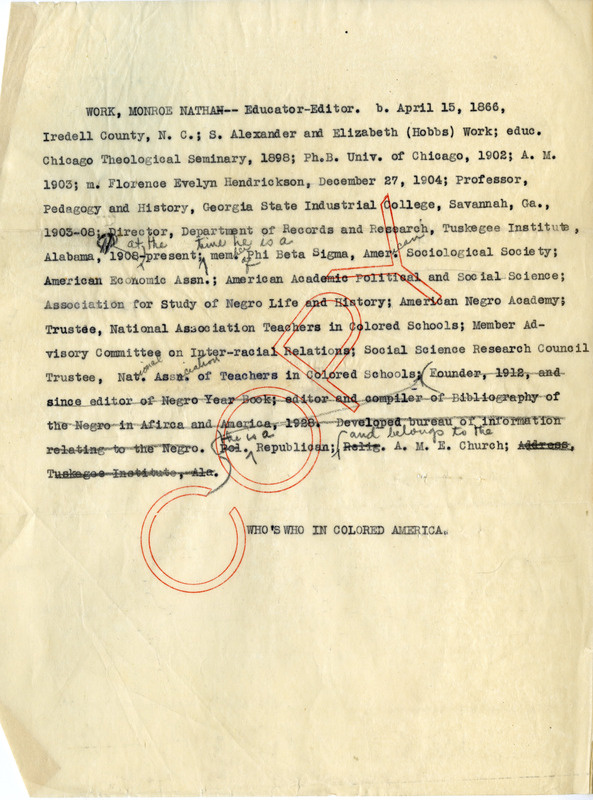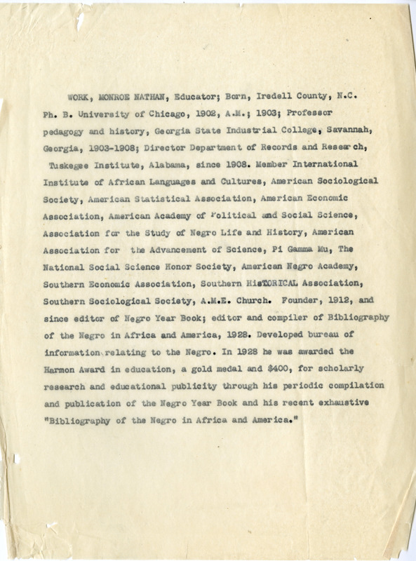 One-page document containing biographical information about Monroe N. Work, such as his work at Tuskegee, his professional accomplishments, and his membership in various organizations. Undated, but latest date listed is 1928.