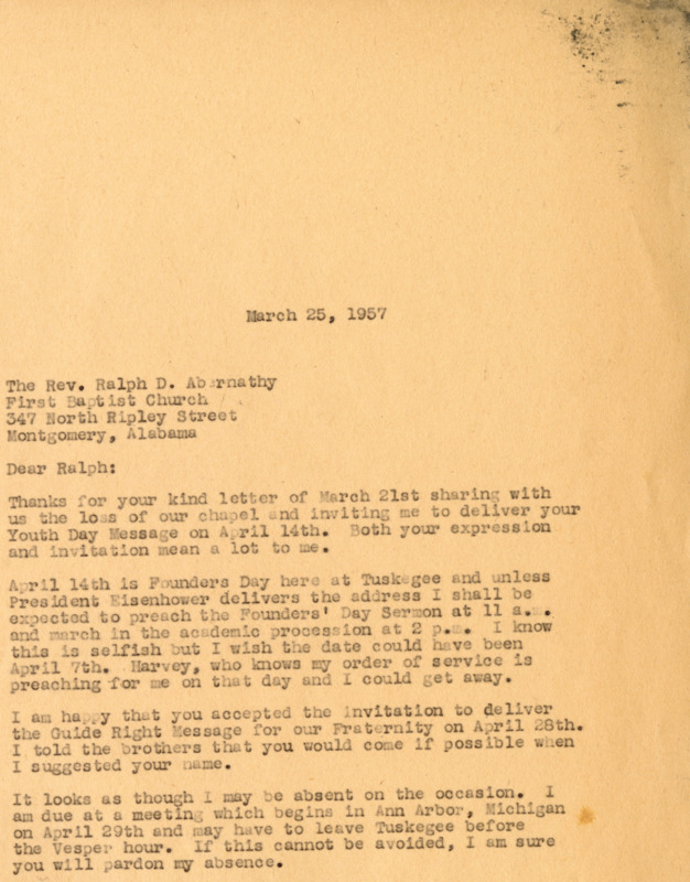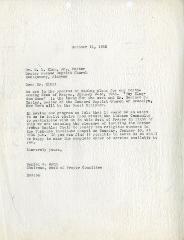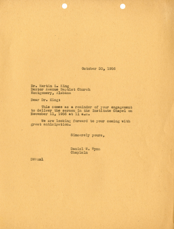 A letter from Chaplain Wynn to Dr. Martin Luther King Jr. reminding Dr. King of his speaking engagement at Tuskegee Institute’s Chapel on 11/11/1956 at 11am.
