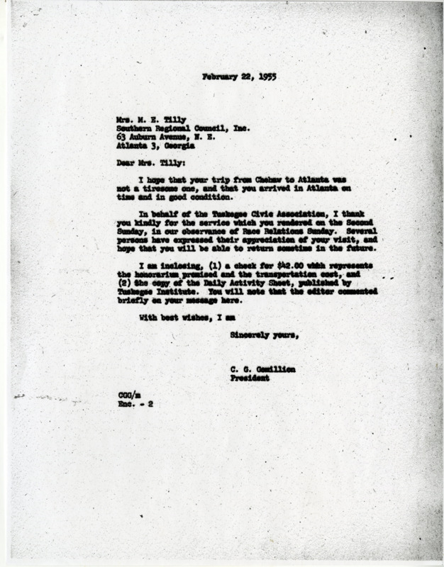 A thank-you letter from Charles G. Gomillion to Mrs. Dorothy Tilly, expressing gratitude for her visit and the services she rendered in observance of Race Relations Sunday.