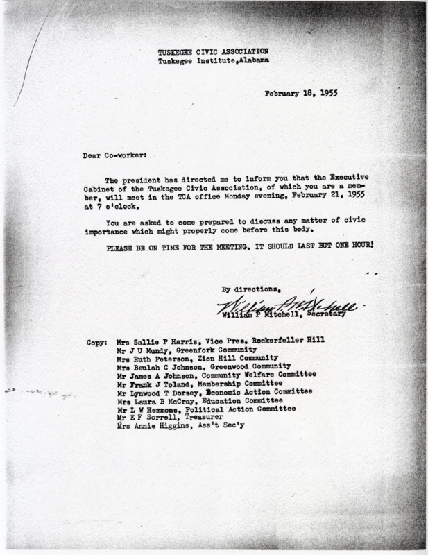 A letter from the Secretary of the Tuskegee Civic Association William P. Mitchell to a coworker to be ready for a general meeting at 7pm on 02/18/1955.
