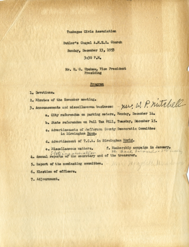 The Tuskegee Civic Association (TCA) calling a mass meeting in response to Senate Bill 291, included a message from K. L. Buford, a local minister and activist in Tuskegee, and speeches of support by Fred Shuttlesworth, Ralph David Abernathy, and Dr. Martin Luther King, Jr.