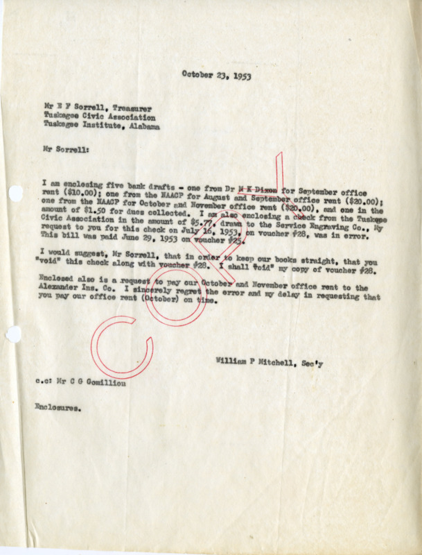 A letter for the Tuskegee Civic Association secretary William P. Mitchell requesting the presence of each member which is needed for an important upcoming TCA meeting.