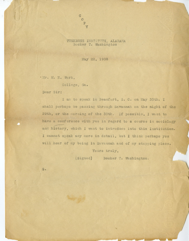 One-page letter requesting that Work meet with Washington about introducing a course at Tuskegee about sociology and history. Washington mentions he will be in Savannah on the 29th or 30th.