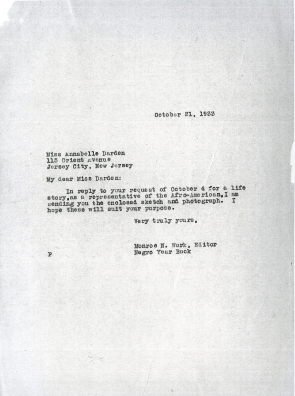 One-page letter responding to Anabelle Darden's request for information about Monroe N. Work to include in the New Jersey Afro-American newspaper. Work included a sketch of his life story and a photograph with his response.