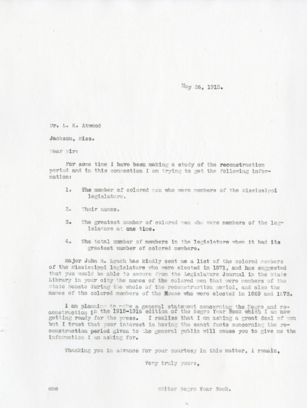 A one page letter from Dr. Work to Dr. L. K. Atwood rquesting information pertaining to the colored men who served in the Mississippi legislature during Reconstruction for the 1915-1916 Negro Yearbook.