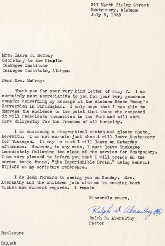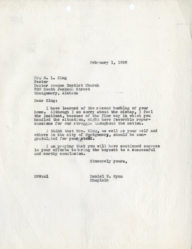 A letter from Chaplain Wynn to Dr. Martin Luther King Jr. on onion paper, offering support to the King after their family home was bombed and offering unwavering support for the Montgomery Bus Boycott.