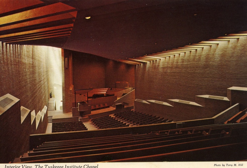 A colored image of the interior of the new Tuskegee Institute Chapel designed by Paul Rudolph, John A. Welch and Louis Fry. Welch and Fry were former Tuskegee students.