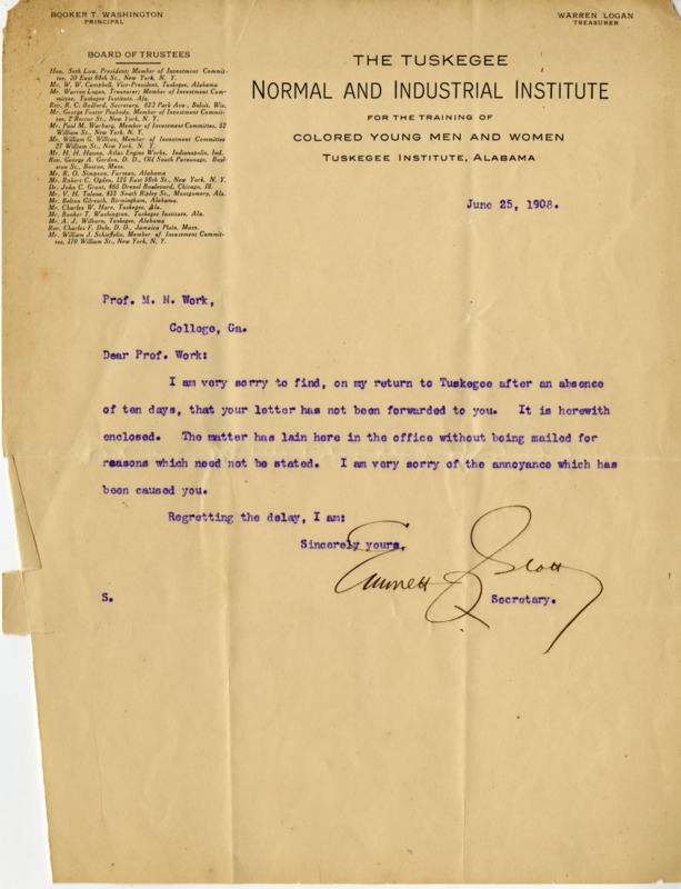 One-page letter to Monroe N. Work in College, Georgia, from Emmett Scott, a secretary at Tuskegee. Scott's letter references a separate letter for Work that had not been forwarded to him. Scott's letter is typed on Tuskegee Institute stationery.