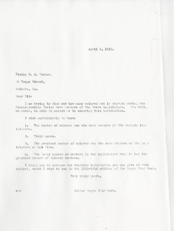 A one page letter from Dr. Work to Bishop Henry McNeal Turner rquesting information pertaining to the colored men who served in the Georgia legislature during Reconstruction.