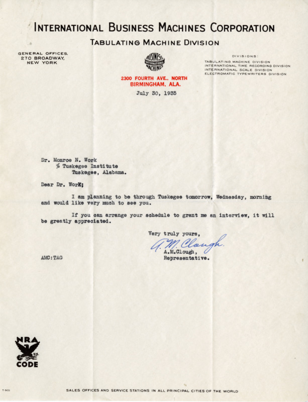 Letter from A. M. Clough requesting an interview with Monroe N. Work for the following day, Wednesday. Printed on "International Business Machines Corporation, Tabulating Machine Division" stationery.