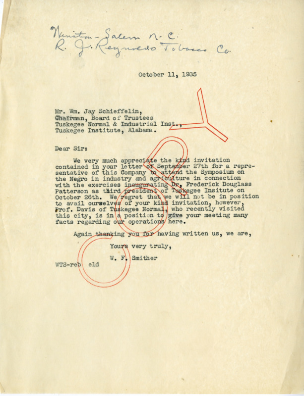 Letter from W. M. Smither to William Jay Schieffelin declining an invitation to attend the "Symposium on the Negro" at Tuskegee Institute. "Winston-Salem, N.C., R. J. Reynolds Tobacco Company" is handwritten across the top of the letter.