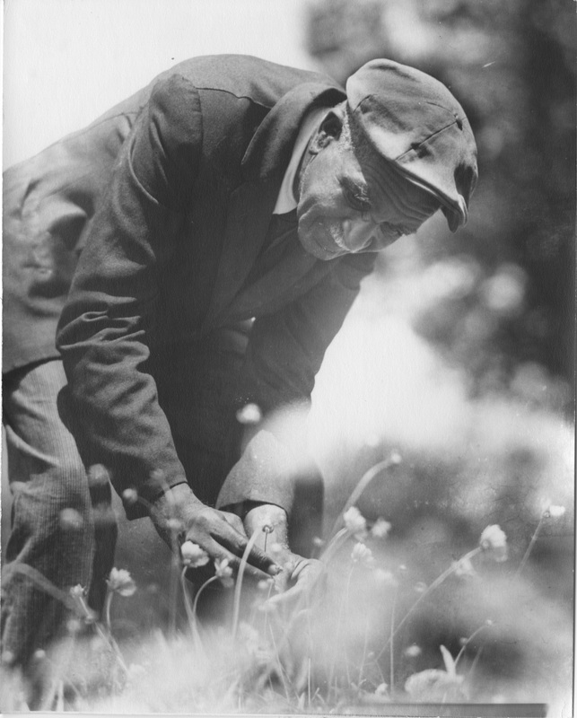 A black and white photo of an elderly George Washington Carver in his lab in the now George Washington Carver Museum. Dr. Carver has a bottle and a beaker in his hands. Carver's picture was tacken by the university's head of photography department and university photographer P.H. Polk.