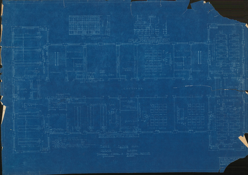 A white and balck architectural drawing created by Robert R. Taylor in 1910 for a dormitory/dining hall for Mississppi Industrial College. The drawing scale is 1/4' 1 foot 0 inches. This drawing shows in depth measurements regarding stair, wall, ground elevations as well as the brick type for the building.