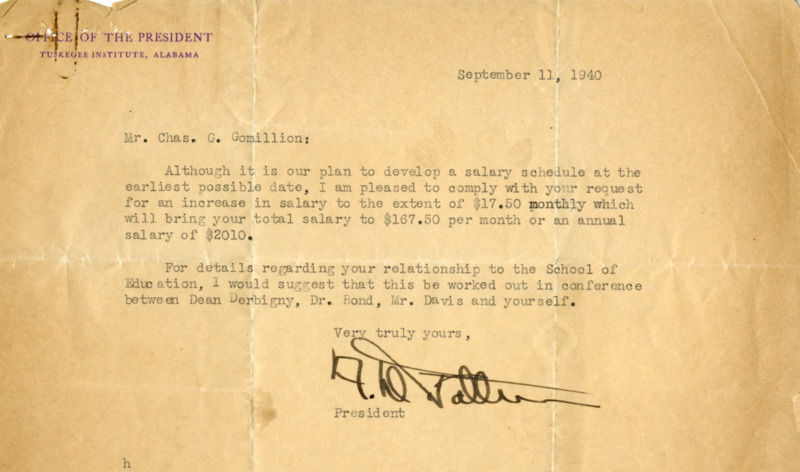 A letter from the third President of Tuskegee University, Dr. Frederick D. Patterson, confirming that Charles G. Gomillion will receive an increase in salary and continue his work at Tuskegee University.
