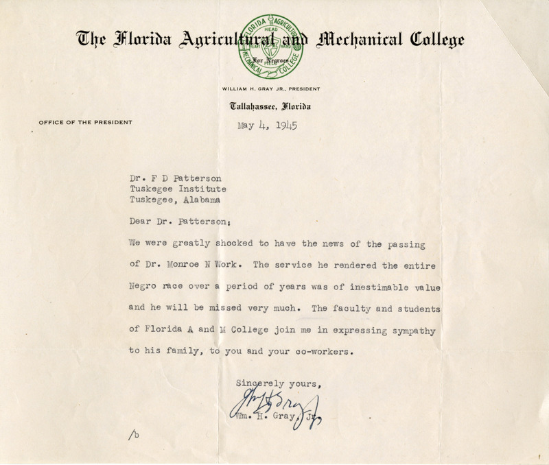 One-page document from Florida Agricultural & Mechanical University's fourth president William H. Gray Jr. offering condolences to Tuskegee president Dr. Frederick D. Patterson on the loss of Monroe N. Work. The work that Monroe N. Work did for the negro race is immeasurable.