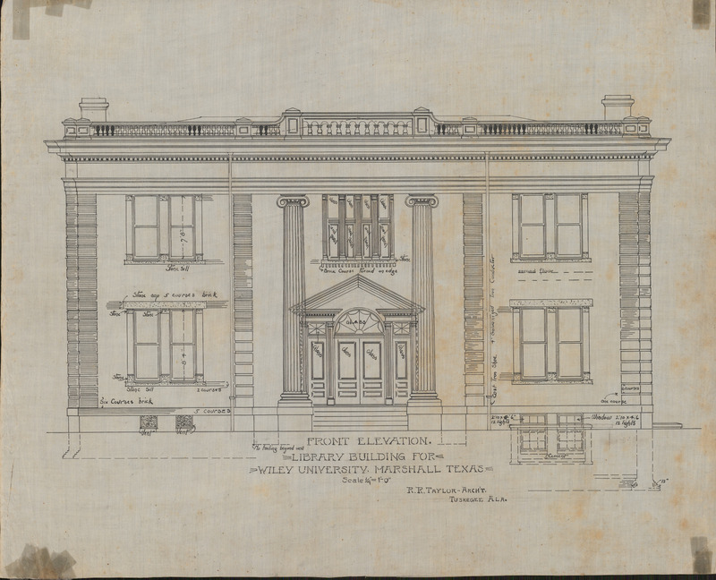 A construction front elevation drawing blueprint of the Library Building at Wiley University. This drawing the front face of the building depciting stone placement, brick placement, window and light placements, and pillars.