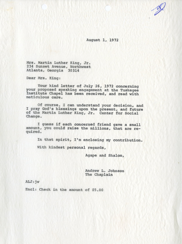 A letter from Chaplain Johnson to Coretta Scott King wishing her well with fundraising for the Martin Luther King Center for Social Justice and a five dollar contribution.