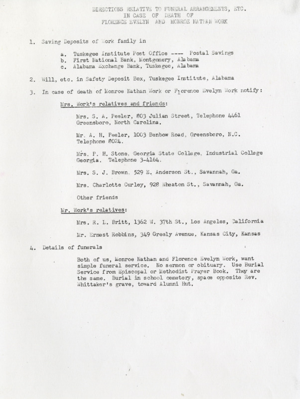 Two-pages of directions in case of the death of Florence Evelyn and Monroe Nathan Work. Contains information on the Work family's saving deposits, will, next-of-kin contacts, and details for funeral services.